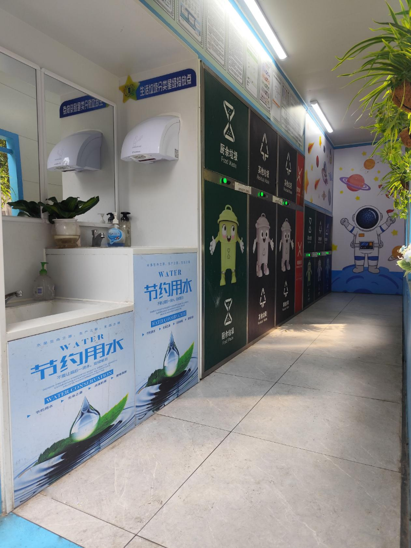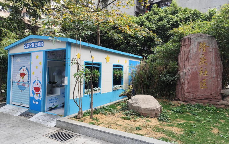 在隆庆社区儿童友好型社区,一座以哆啦A梦为主题的生态小屋成为网红打卡点。蓝色星际主题外观中,佩戴竹蜻蜓的机器猫与海洋元素巧妙融合,配置儿童专属投放口及洗手台,通过符合儿童人体工学的设施设计,践行“垃圾分类从娃娃抓起”理念。该投放点集智能除臭、语音提示等科技功能与童趣设计外观于一体,实现审美性、教育性与功能性的有机统一,崭新的墙面、宽敞的活动区吸引青年老少驻足玩耍共同参与到垃圾分类新时尚。