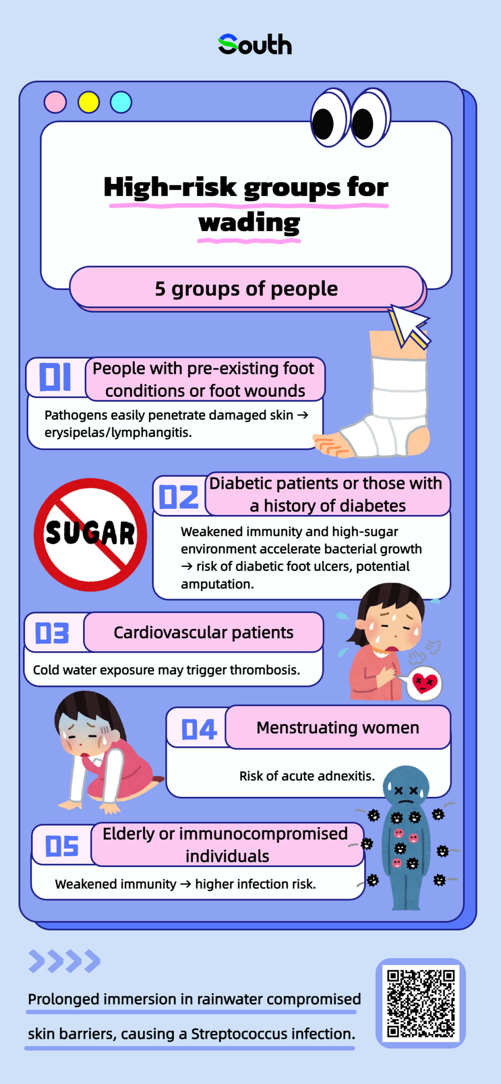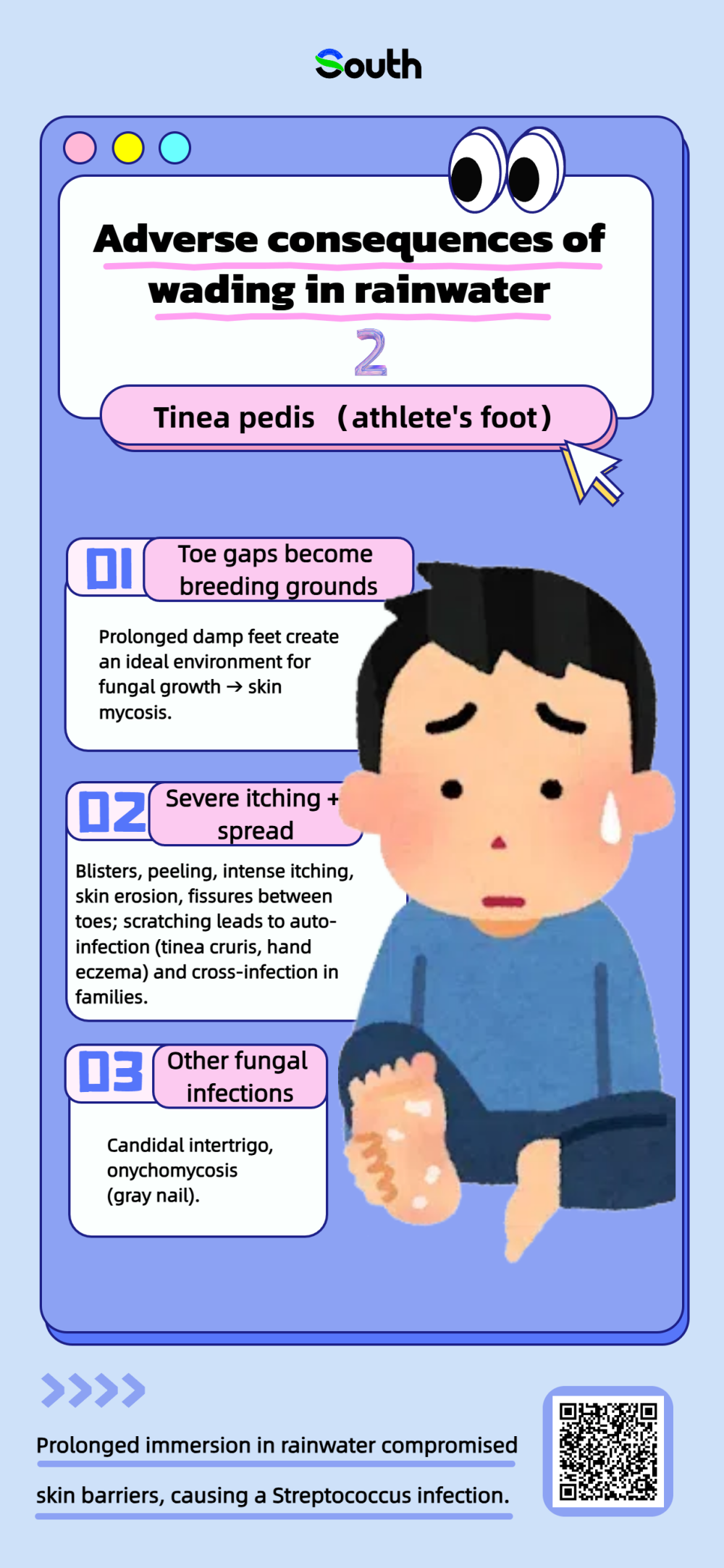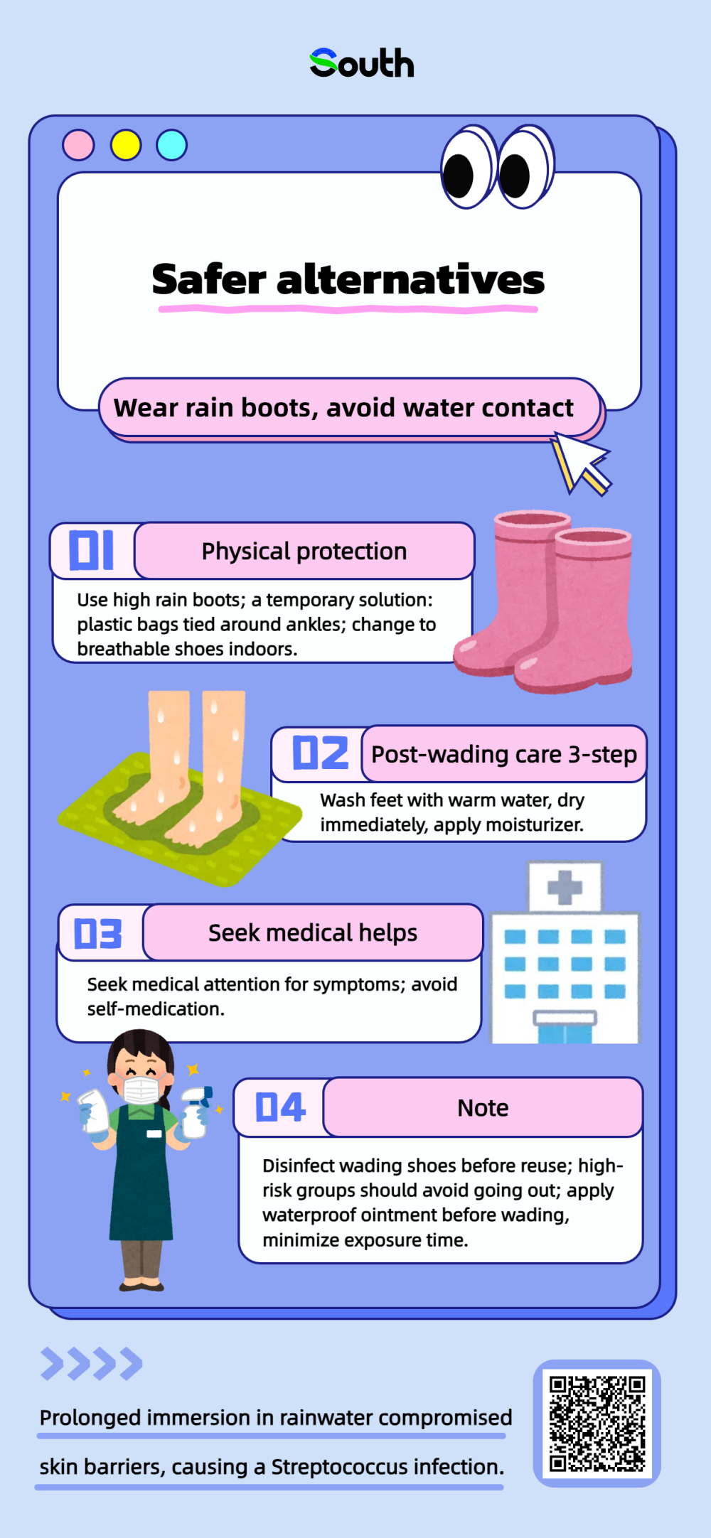 According to the National Emergency Broadcasting, in May this year, a man in Guangzhou encountered a sudden rainstorm and chose to wade through water without changing shoes all day. The next day, he developed a 40℃ fever and a red, swollen, painful left leg, diagnosed with the skin disease erysipelas. Doctors explained that prolonged immersion in rainwater compromised skin barriers, causing a Streptococcus infection, which could lead to sepsis if not treated promptly.
