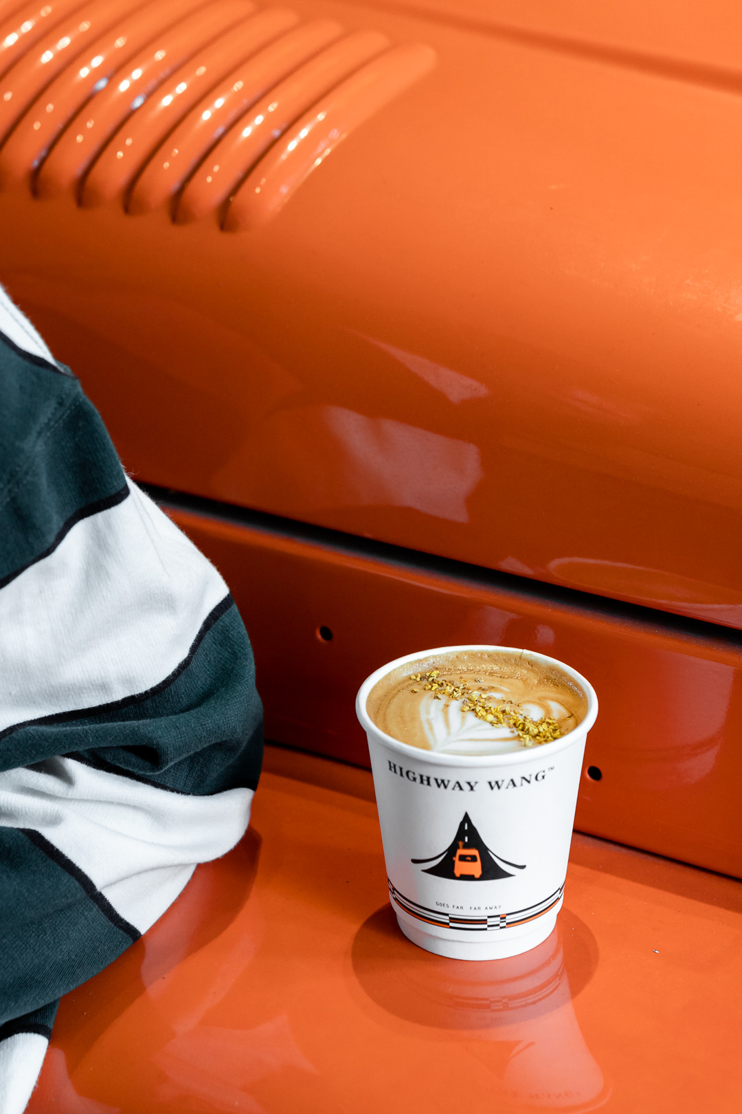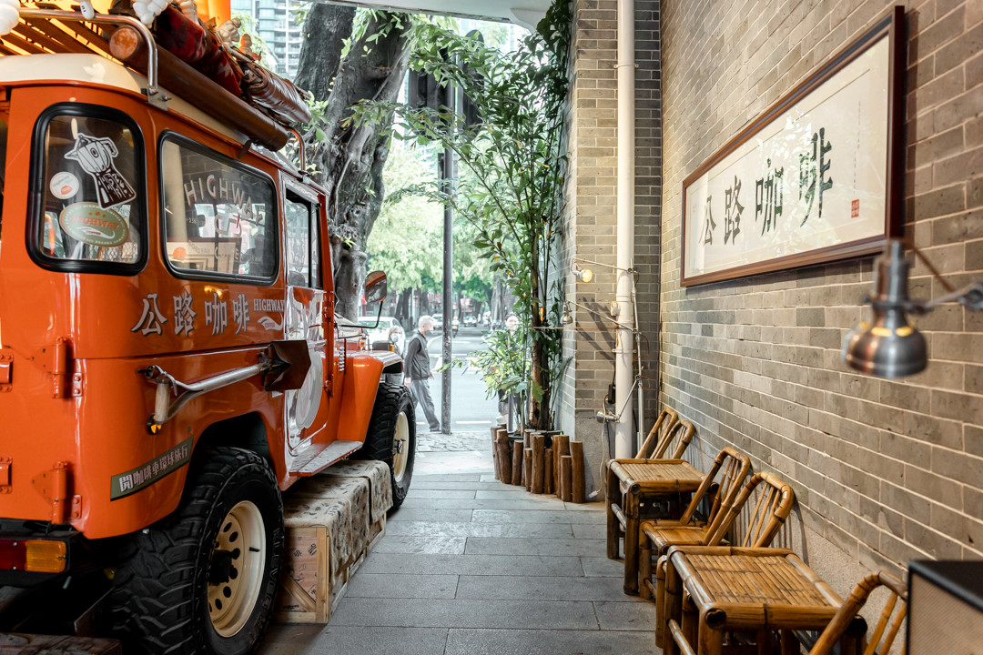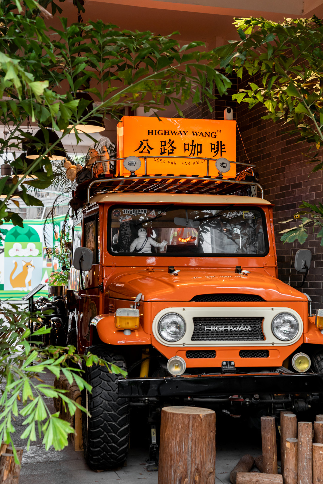 Highway Wang is a fancy orange jeep car attracting both fashionable youngsters and older people on their way to grocery stores when walking under the arcade.