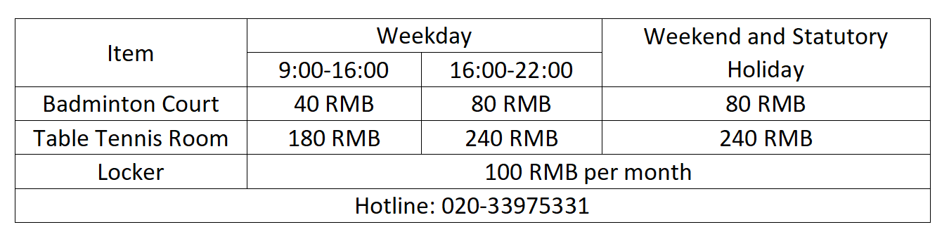 Guangzhou Xiwan Gymnasium Charging Standard (1 court or room per hour):