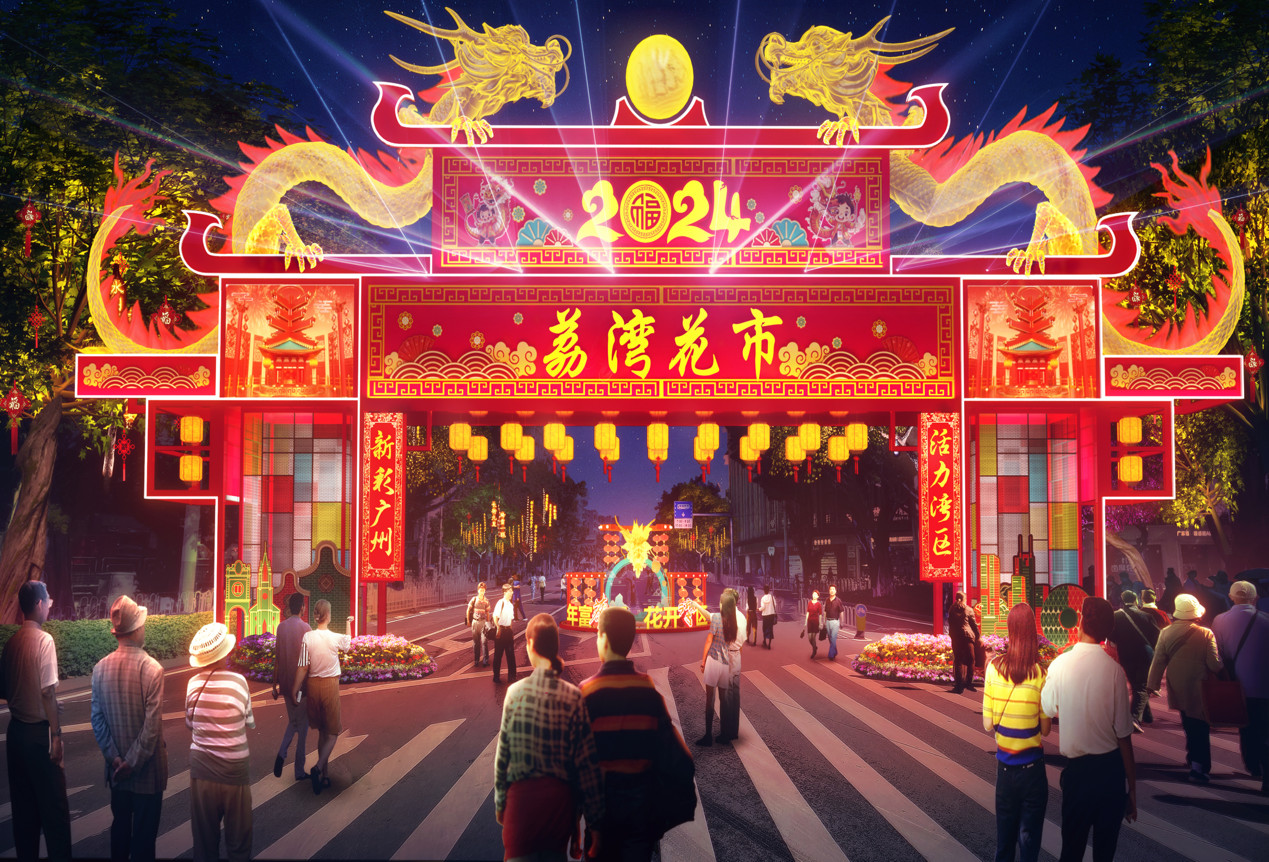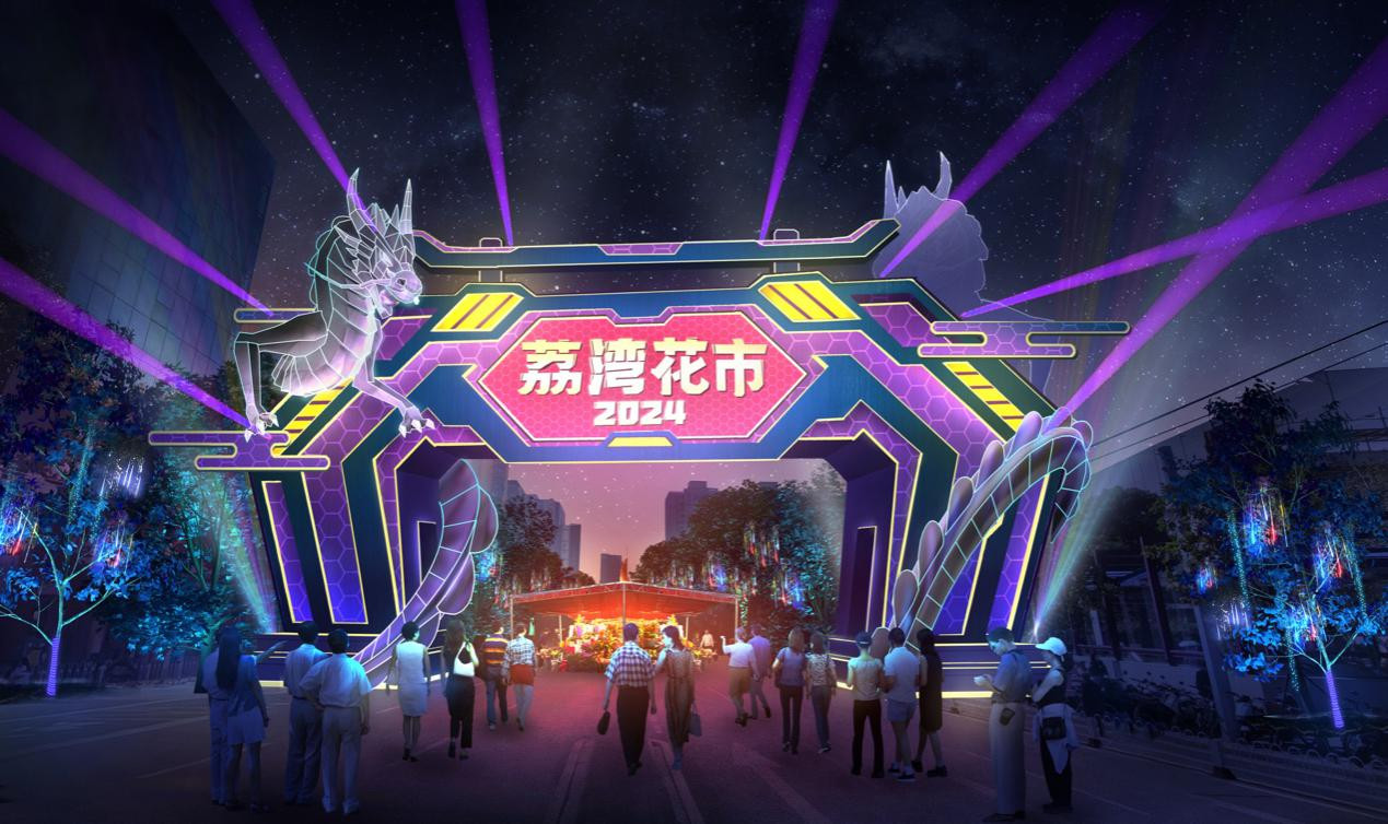 In 2024, the Liwan Flower Fair will debut a unique design with "North-South" dual archways. The southern archway draws inspiration from the Chen Clan's Academy arch, a representative of Cantonese architecture, seamlessly merging traditional and modern Lingnan styles. The northern archway showcases a futuristic theme with a digitized dragon, incorporating elements of the dragon year creatively. Both archways symbolize the rejuvenation of the 14 historical and cultural districts in Liwan District.