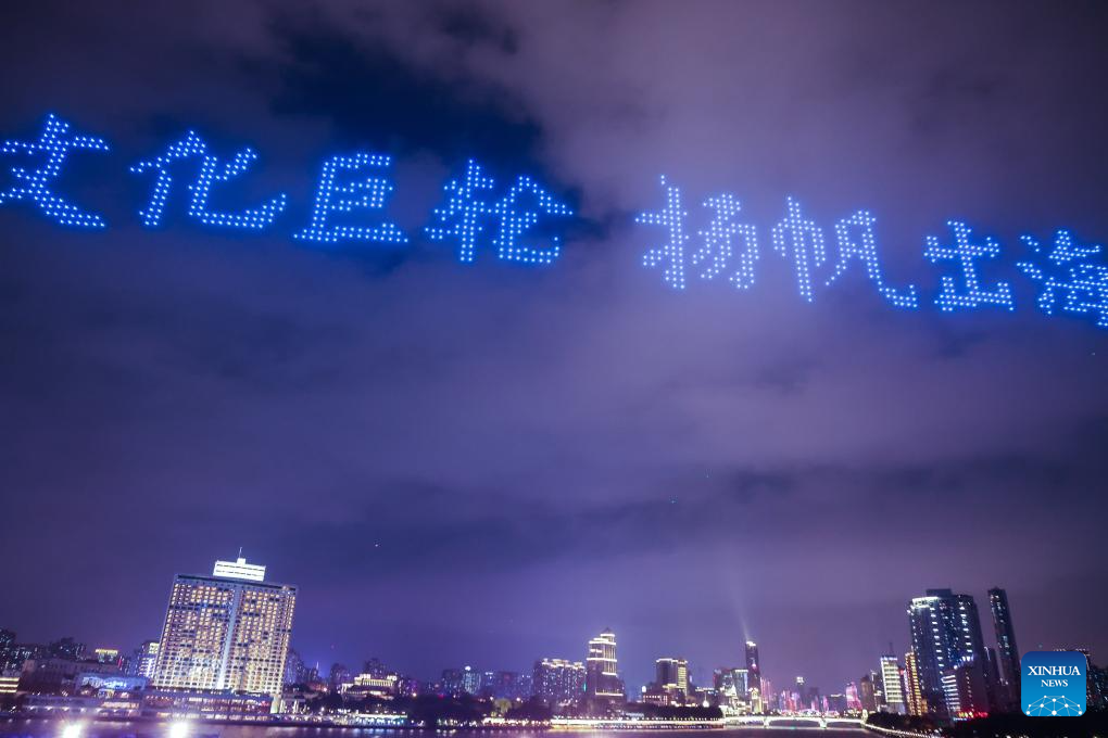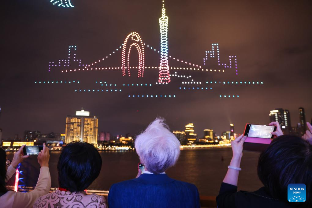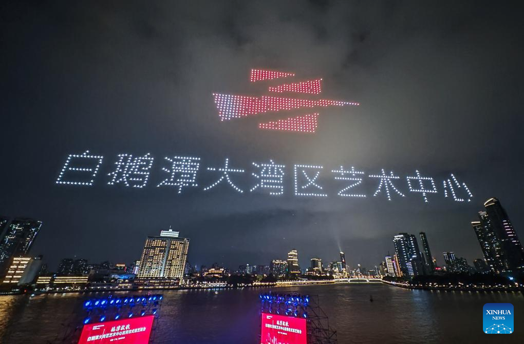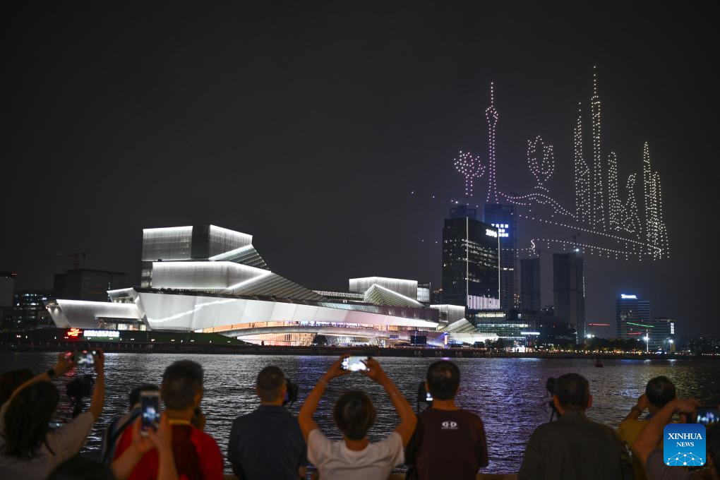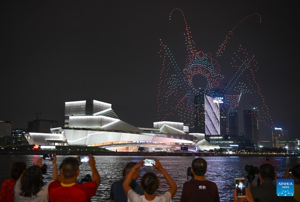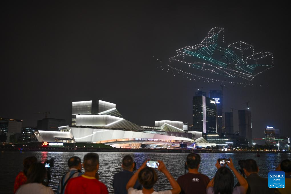 A drone show is staged around the Bai'etan Greater Bay Area Art Center in Guangzhou, south China's Guangdong Province, April 28, 2024.