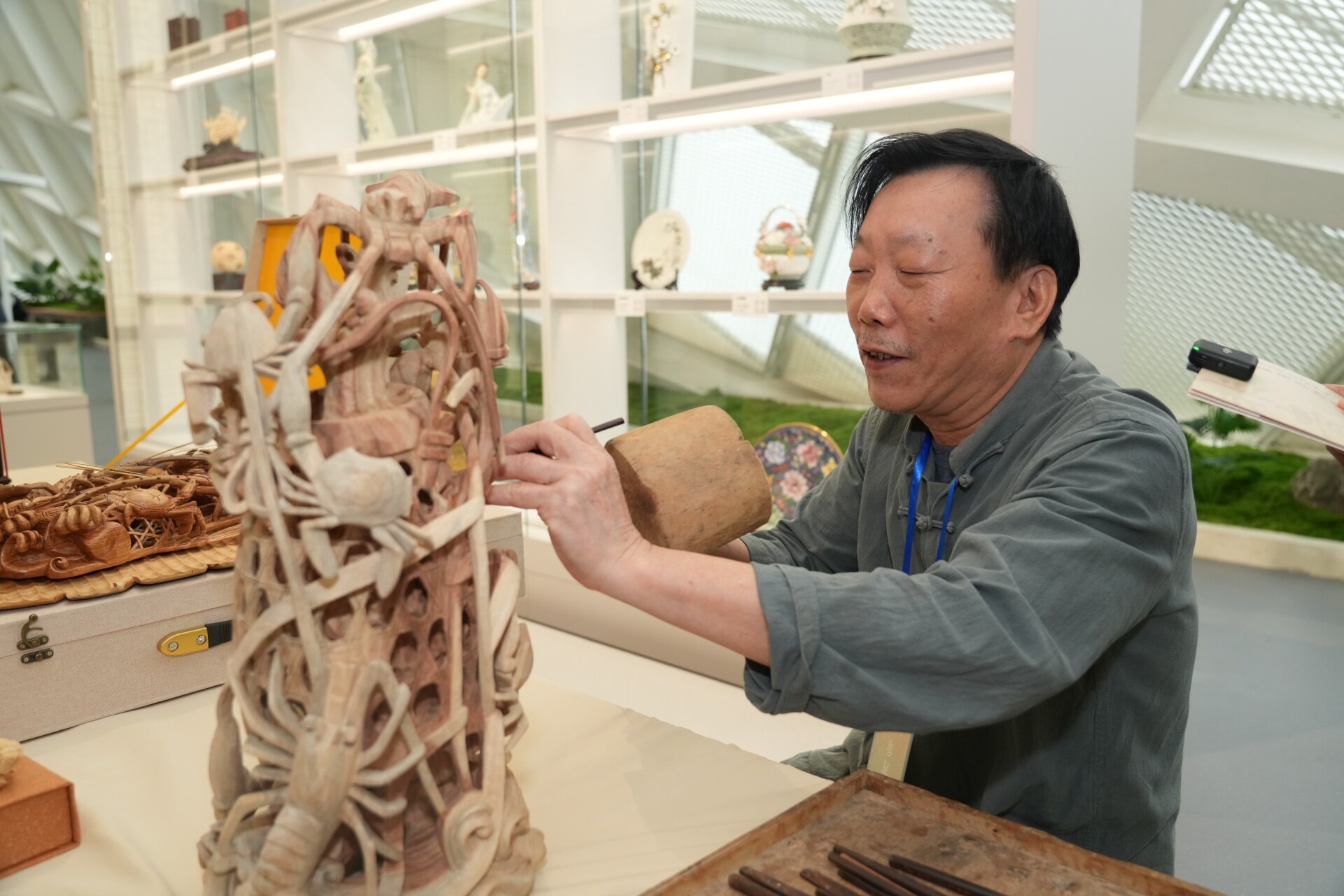 Jin Zisong, the provincial representative inheritor of Chaozhou wood carving, showed his skills at the exhibition hall.