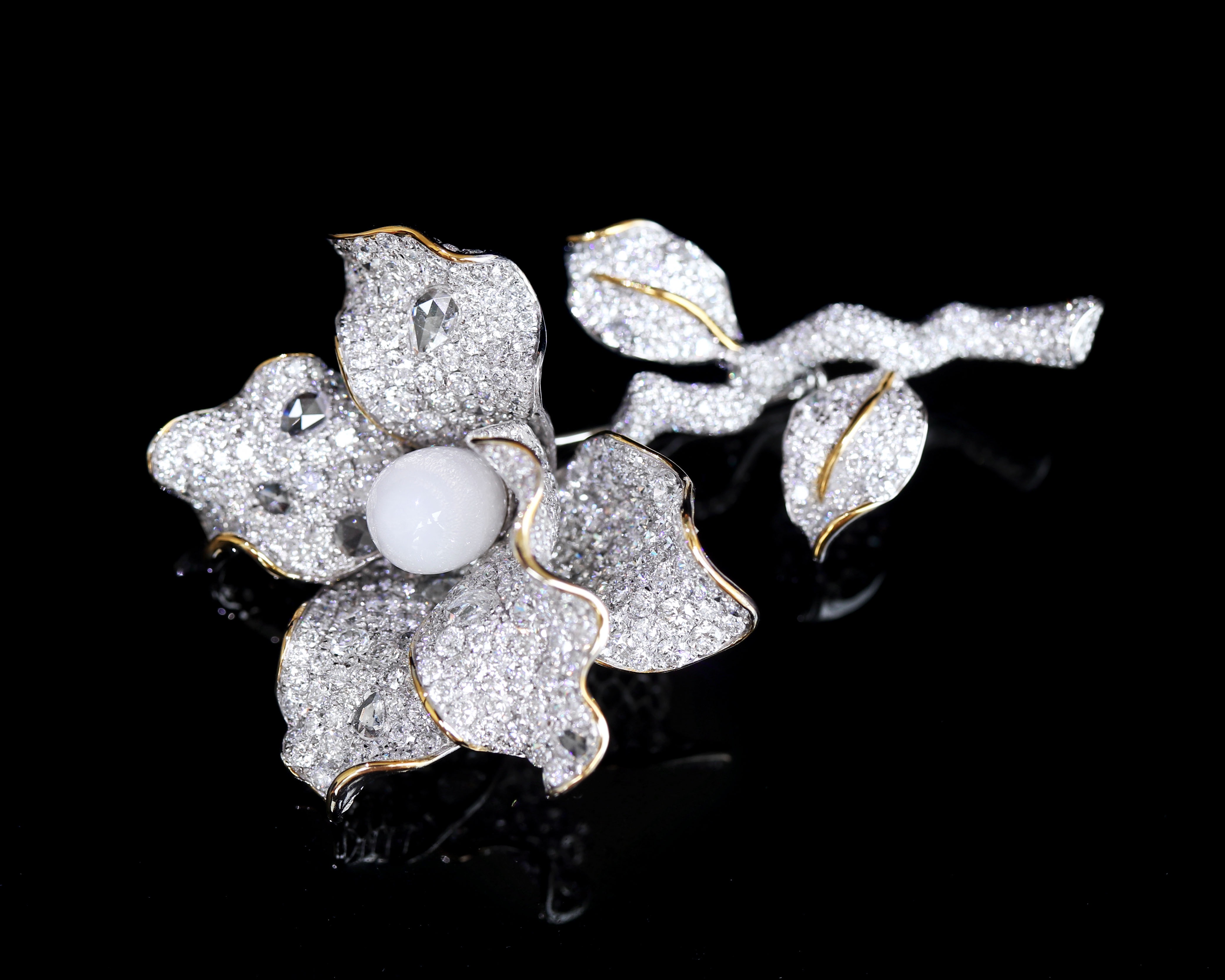 Zhan Yuexin, a craftsman specializing in precious metal jewelry making, introduced her proudest work exhibited at the heritage exhibition, the "Lustrous Moonlight: Orchid Flame Conch Bead", a rare white conch bead brooch. "The piece is hand-carved from wax, with a honeycomb base and a dynamic shape. The orchid design is ingenious, with clear layers of petals and exquisite details, as if you can smell its elegant fragrance. The starting bid in the market exceeds one million RMB."