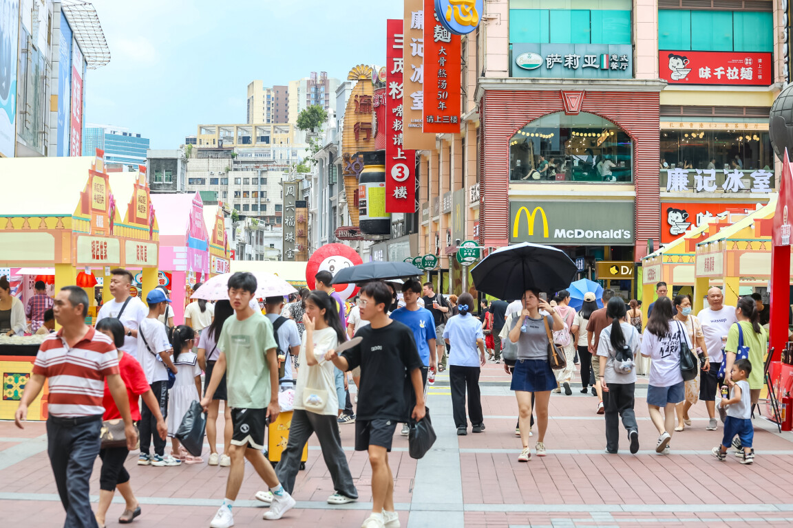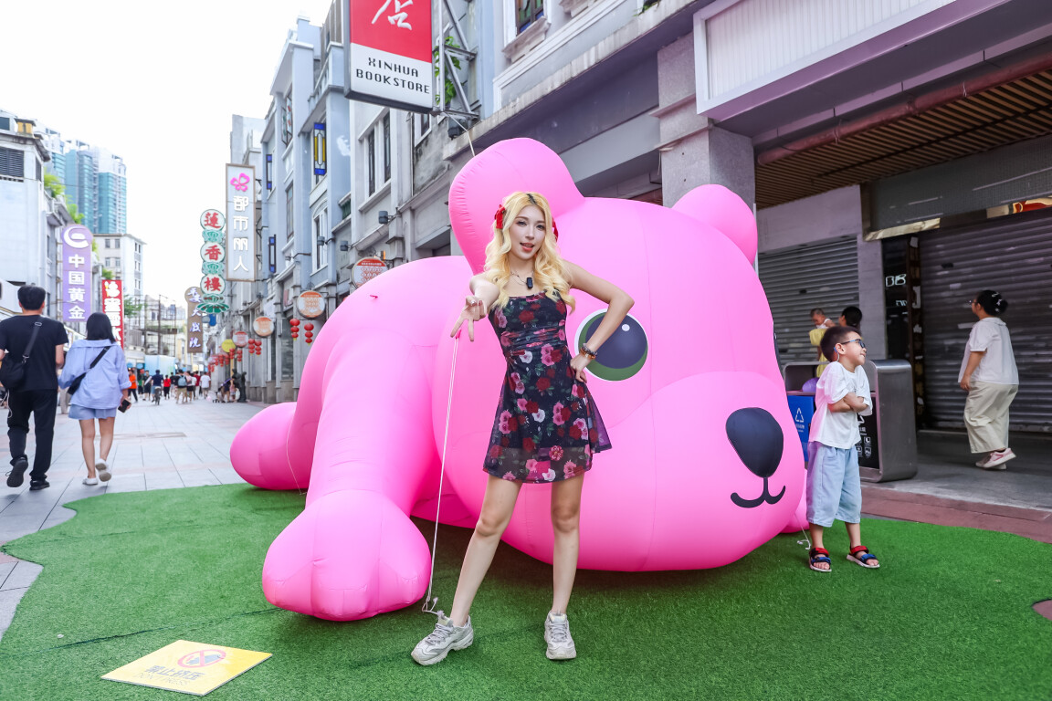 A giant pink bear appeared on Shangxiajiu Pedestrian Street, attracting numerous tourists to take photos. This marked the grand opening of the 10-day carnival of Guangdong, Hong Kong, and Macao music and cuisine. From July 19 to 28, visitors can taste authentic Xiguan snacks and cuisines at the markets while enjoying local band music during the event.