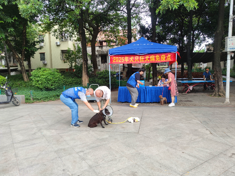 当天上午,区动物防疫监督所的技术人员便提前抵达五眼桥新基公园,迅速完成免疫工作点的布置。现场不仅划分出犬只登记区、健康检查区、疫苗接种区及观察区,并准备了消毒用品、应急药品等物资,确保免疫工作有序高效开展。