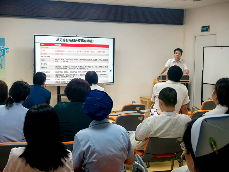 本次培训特邀广州中医药大学第三附属医院(简称“广中三院”)心血管专家夏裕教授担任主讲。夏教授结合《胸痛中心建设与管理指导原则》及基层接诊实际,围绕胸痛中心预检分诊核心展开讲解:先是系统解读“胸痛、胸闷、气促”等“必问八大主诉”的问诊要点,重点剖析心前区闷胀、中老年无诱因肩痛、女性非特异性疲劳等15项心源性疾病等同症状的鉴别技巧,避免因症状不典型导致漏诊;同时明确急性胸痛救治关键时间节点——医护接触患者10分钟内完成首份心电图、20分钟内获取肌钙蛋白报告,以及转诊病历资料准备、救护车转运监护、“先救治后收费”绿色通道执行等实操流程,确保基层与上级医院高效联动。