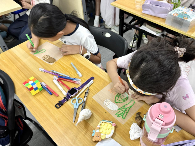 随后,手工环节将活动推向高潮。在老师的带领下,孩子们用水彩笔在特制卡片上描绘出“泮塘五秀”,紧接着老师帮孩子们把卡片剪好,并吹制加工,变成一个个小装饰,孩子们脸上都洋溢着开心的笑容。