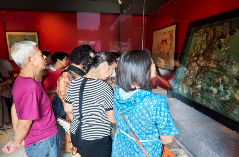 在展览主题讲解环节,讲解员娓娓道来,向党员们深入阐释工艺美术精品如何巧妙呈现伟大的抗战故事与不同时代的民族精神。党员同志们围在展品旁,目光专注,一边欣赏精美的工艺,一边认真聆听、不时记录,在艺术的熏陶中赓续伟大的抗战精神。当历史影像展播时,那一幕幕珍贵而震撼的画面,让在场党员神情凝重,仿佛被带回到那段波澜壮阔、浴血奋战的岁月。