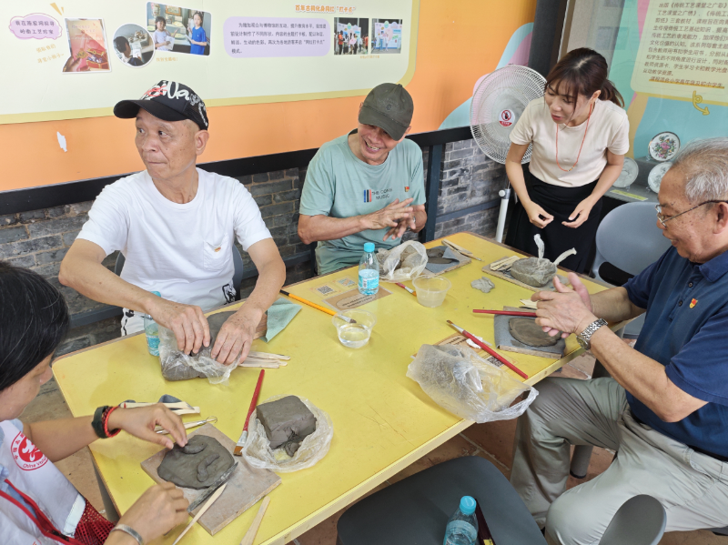 陶艺手工工作坊里气氛热烈,工艺师耐心指导制作陶瓷冰箱贴,党员同志们热情似火。他们精心雕琢,将对抗战精神的敬意与对和平的向往融入石湾陶作品中。有的巧妙塑造出行军壶的形状,质朴而厚重;有的精心捏出和平鸽的姿态,灵动而祥和。