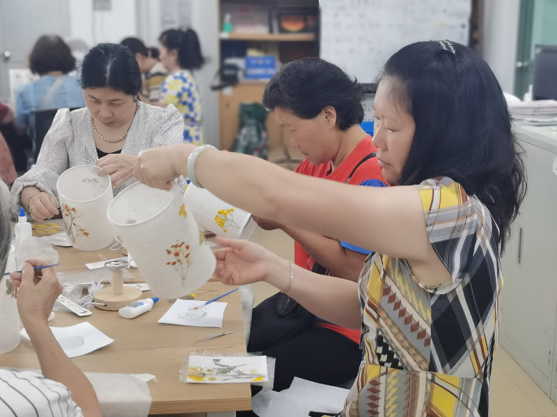 活动现场布置温馨,材料准备齐全。在手工老师的耐心指导下,居民们充分发挥想象力与创造力,精心挑选干花素材,细心设计布局,将一朵朵绚丽的花朵粘贴在灯罩上。大家互相交流配色心得,分享生活趣事,巧手翻飞间,一盏盏独一无二、充满艺术气息的压花台灯逐渐成型。现场欢声笑语不断,气氛融洽热烈。