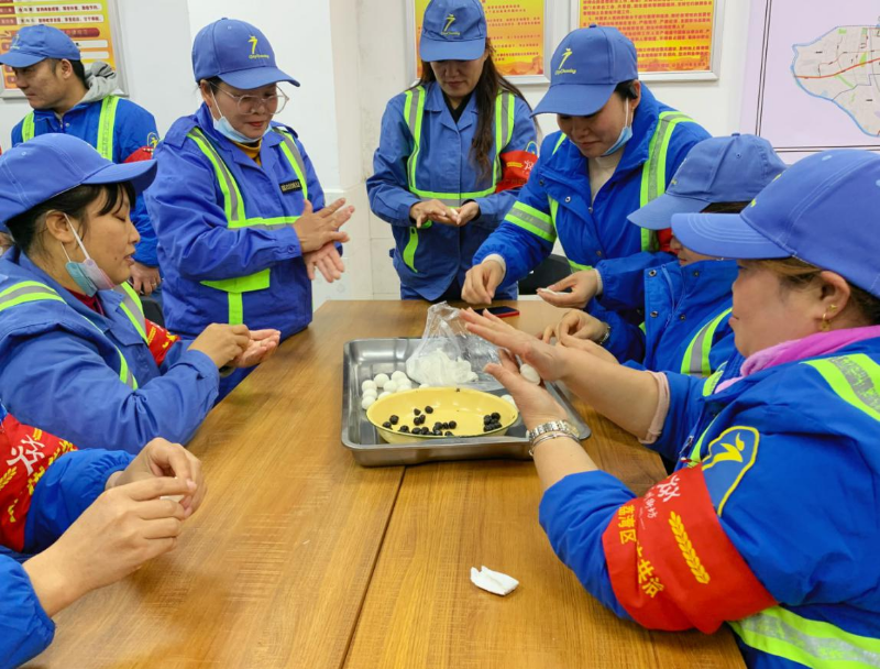 活动现场热闹非凡,糯米粉、馅料摆放整齐,环卫工人们纷纷挽起袖子,揉面、放馅、搓圆,手法娴熟,动作麻利。“和大伙一起过节,特别开心,感觉就像一家人一样。”大家一起包汤圆,一起唠家常,欢声笑语在现场回荡着。
