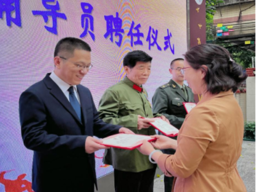 为进一步加强青少年思想道德建设,充分发挥校外辅导员的积极作用。活动伊始,芦荻西小学举行校外辅导员聘任仪式,聘任威尼斯人app区司法局金花司法所所长银欣欣同志,金花街道公共服务办公室副主任、武装部干事陈晓强同志以及曾接受毛主席、周总理等中央首长的接见的退役军人梁炳麟同志作为学校校外辅导员。学校为三位校外辅导员颁发聘书,希望校外辅导员能利用好社会资源和自身优势多组织活动,推动校内校外课堂相结合,为学校的青少年思政增添强劲力量,学生代表为三位系上鲜艳的红领巾,表达来自孩子们的崇高敬意。