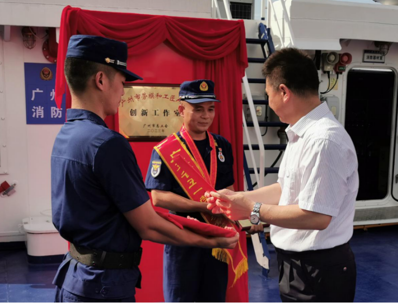与会人员在讲解员的引导下参观了水上救援站,近距离了解了水上救援站队伍发展历程和“邓洪工作室”建设情况,并观看了邓洪成长纪录片《我的船长我的船》。在“穗消06号”船一层甲板上,与会领导为“邓洪工作室”正式揭牌,并向邓洪同志颁发广东省五一劳动奖章。