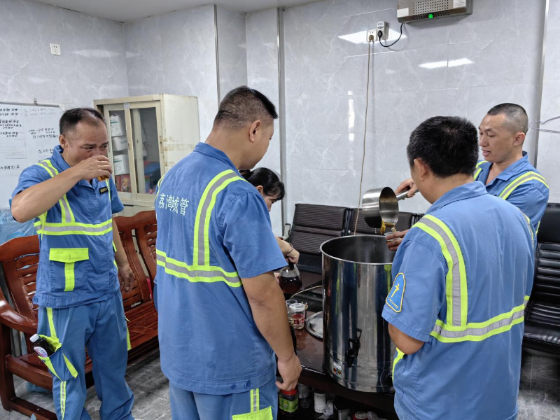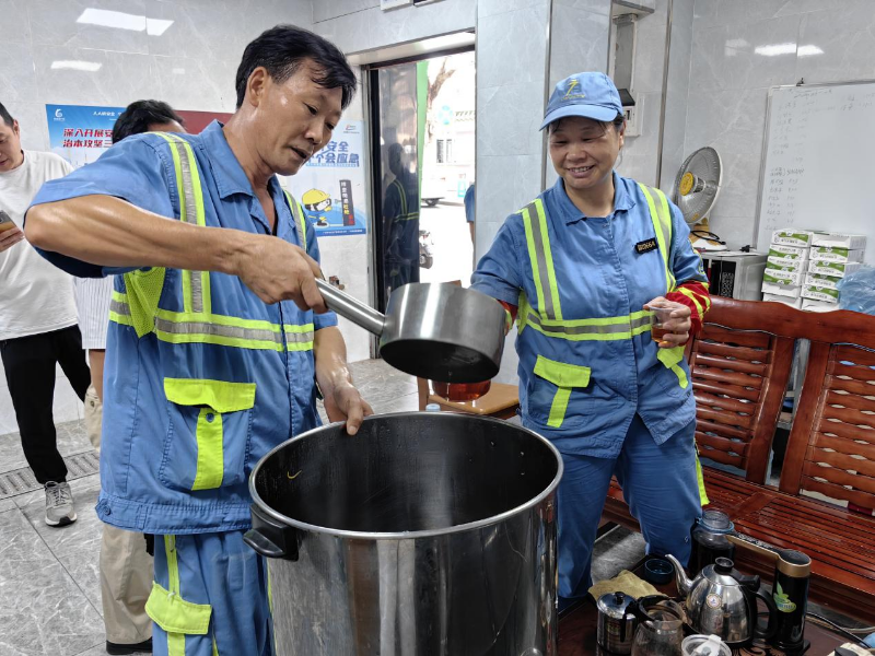环卫工人张大姐在环卫驿站休息纳凉的时候跟工友闲聊道:“这么热的天能在口渴的时候喝上一杯凉茶,特别舒服!”从6月份起,按照相关规定向环卫作业人员发放高温津贴,在环卫驿站配置藿香正气液、清凉油等防暑药物和碘伏消毒液等日常医疗药品;定期组织后勤人员精心熬制具有广东特色的消暑凉茶和糖水,并安排专人将凉茶和糖水送至辖内环卫驿站,确保让每一名环卫工人都能喝上消暑凉茶和糖水。此外,还开展一系列学习培训,通过举行安全作业培训,讲解防暑降温小妙招以及中暑救护技能,帮助环卫工人提升防范暑热的能力。