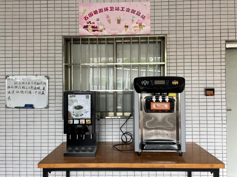 针对高温户外作业,叮嘱一线环卫作业人员可以就近到环卫驿站休息纳凉,避免长时间连续高温作业。辖内环卫驿站均配备饮水机、风扇、空调、冰箱、常用药品箱等设施,满足环卫工人休息、如厕等日常需求。值得一提的是,石围塘环卫驿站全面升级各项硬件设施,先后购置了雪糕机和咖啡机,将茶水间改造成甜品加油站;将空置的工具房改造成图书阅览室和职工休息室,为环卫工人提供舒适休息环境;在厨房购置养生壶等设备,供环卫工人自行使用。硬件的全面升级,真正实现为环卫工人冬天送温暖,夏天送清凉。