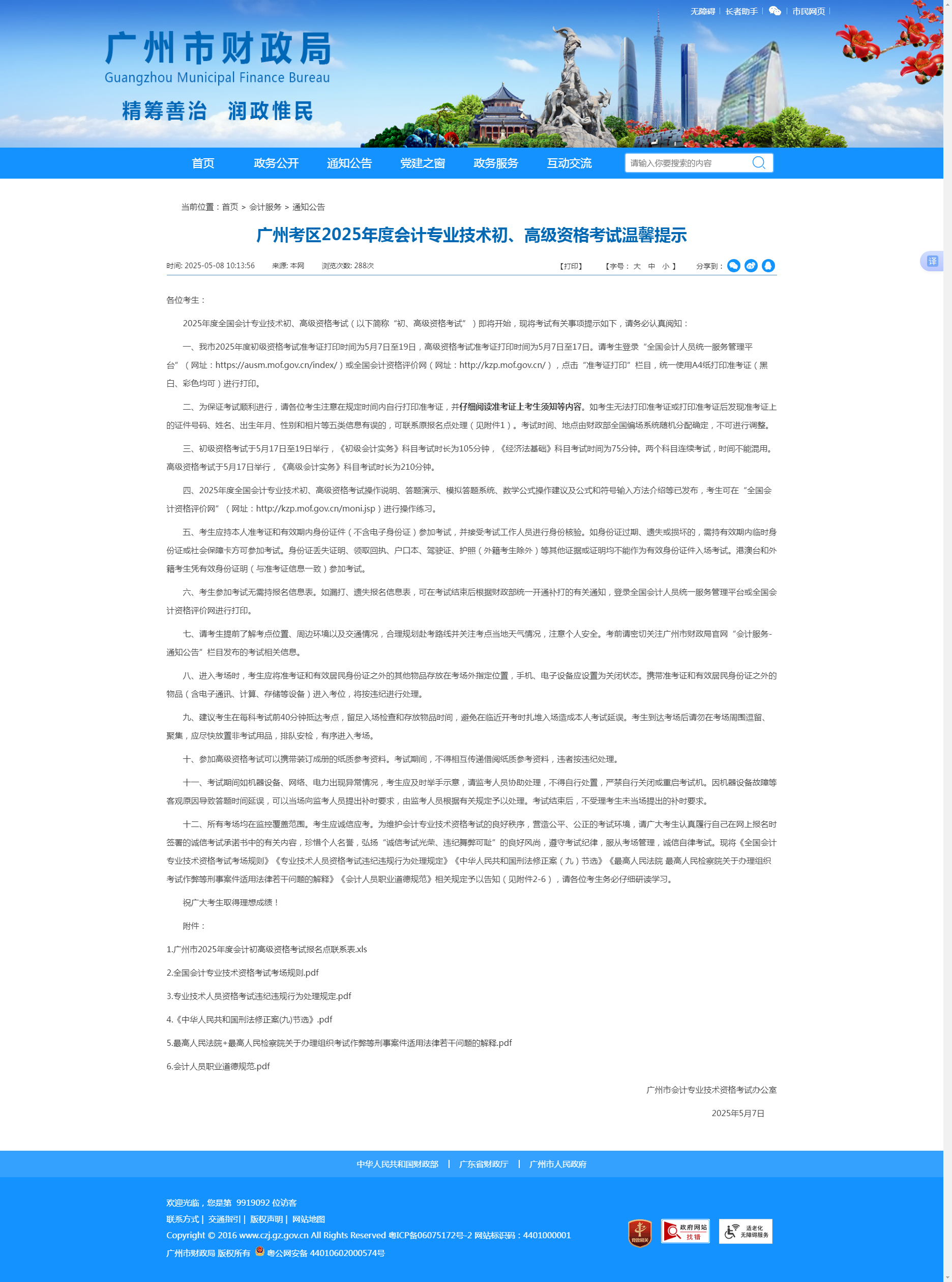 《广州考区2025年度会计专业技术初、高级资格考试温馨提示》已在广州市财政局官网发布,请各位考生认真查阅并遵照执行。