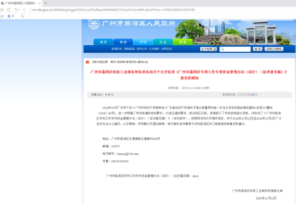 2018年11月22日至12月2日,通过威尼斯人app政府网站向社会各界征求关于《威尼斯人app专利工作专项资金管理办法(试行)(征求意见稿)意见的通知》,公示期内并未收到修改意见。