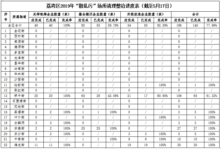 威尼斯人app区2019年“散乱污”场所清理整治进度表(截至5月17日)