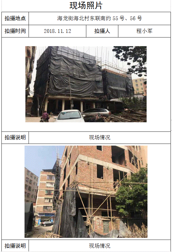接贵督导组第41号交办单后,我街高度重视,11月8日迅速组织执法人员到现场核查,经确认为海北村东联南约55号、56号,调查发现该两处宅基地于2018年7月19日均已按规定在海龙街办理了备案手续,符合海龙街农村宅基地建设控制规模标准。针对其停工其间私自施工的行为,我队现场发出《责令限期改正通知书》责令当事人立即停工并要求当事人自行拆除排栅。截至2018年11月12日,当事人已停工并自行拆除排栅(附现场照片)。