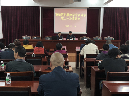2018年12月20日,区扫黑除恶办联合茶滘街、东漖街在茶滘街道办事处六楼会议室召开扫黑除恶专项斗争第二十次宣讲会。茶滘街、东漖街各分管领导、街扫黑成员单位业务骨干、社区(联社)书记和副书记及治保主任、社区居民代表共110余人参加。
