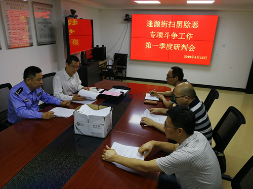 4月10日下午,逢源街在街综治维稳中心会议室召开了扫黑除恶专项斗争工作第一季度研判会,就逢源街2019年第一季度辖内“扫黑除恶治乱”工作进行小结。会议由街党工委副书记钟颖跃主持,街综治办、派出所、来穗中心参与会议。会上派出所通报了1-3月辖内的整体治安情况,来穗中心介绍了流动人口管理服务情况,综治办则主要介绍了宣传活动、线索排查和社会防控等方面的工作开展情况,会议还研判了逢源街最新的综合治理情况,分析了难点、重点问题,研讨工作对策。钟副书记重点强调了区委政法委和扫黑除恶专班对专项斗争工作的要求,指出各部门需进一步加强沟通协作,更深入地开展线索排查,更好地发挥综治信息平台、网格平台和每周的联合执法行动会议的作用,全力打好2019年扫黑除恶攻坚克难这一仗。