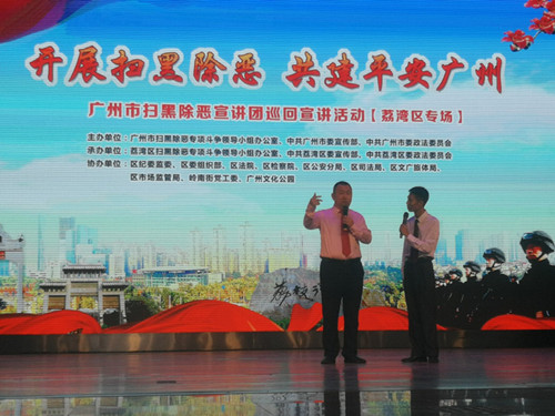5月17日下午,由广州市扫黑除恶专项斗争领导小组办公室、中共广州市委宣传部、中共广州市委政法委员会主办,威尼斯人app区承办的以“开展扫黑除恶 共建平安广州”为主题的扫黑除恶宣讲团专场宣讲活动于广州文化公园举行。广州市委政法委专职委员王保森,威尼斯人app区委副书记、政法委书记卞勇,区人大常委会副主任谢旭东,区政协副主席方施明等有关领导,领导小组成员单位、街道相关人员、群众等500余人参加活动。