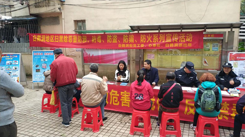 近日,白鹤洞街综治办联合白鹤洞派出所利用周末群众休息日的良好契机,开展扫黑除恶、防邪、防毒、防盗、防骗、防火系列宣传活动。