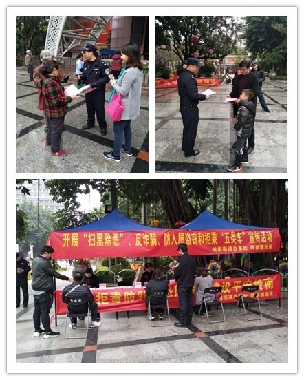 2019年1月5日,岭南街联合岭南派出所在文化公园举办以“知法守法·远离赌博”为主题的扫黑除恶宣传活动。在活动现场,岭南派出所通过以案释法、现场咨询、法制宣传、发放宣传品、宣传展板等形式,深刻揭露赌毒、邪教等涉黑恶违法犯罪的表现形式和对个人、家庭、社会带来的严重危害,同时宣传讲解国家法律政策规定,鼓励广大市民群众积极举报相关黑恶犯罪。现场派发宣传单200多份,参与人数110多人,发放宣传品110多份。