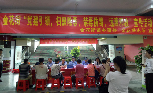 2018年8月13日下午,金花街党工委、办事处和金花派出所联合在康王地下城举行了“党建引领,扫黑除恶,禁毒防毒,远离邪教”宣传活动。工作人员向现场群众派发了《致全区人民群众开展扫黑除恶专项斗争的公开信》500多份,活动还邀请了区公安分局扫黑办、反恐大队、交防大队、街司法所等部门参与。
