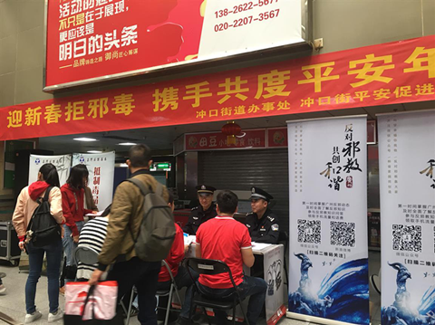 1月31日上午,值新春佳节来临之际,冲口街办事处联合属地芳村客运站场,在芳村客运站候车大厅开展了以“迎新春拒邪毒,携手共渡平安年”为主题的扫黑除恶、防邪拒毒及群防群治等综治综合宣传活动。