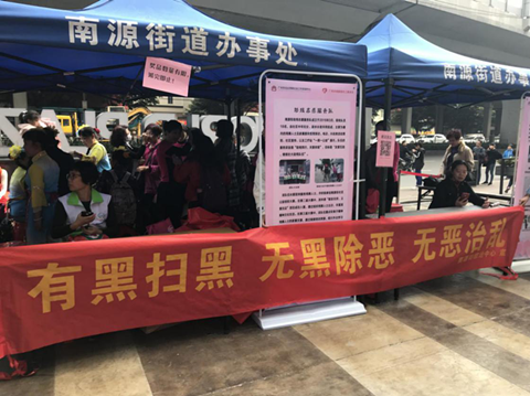 2019年1月19日下午,南源街扫黑除恶办在南岸路圣地新天地广场举行扫黑除恶宣传活动。活动上向居民派发了“致全区人民群众开展扫黑除恶专项斗争的公开信”、宣传小册子,讲解了扫黑除恶的重要性。活动共吸引300余人参与,发放宣传资料100余份。