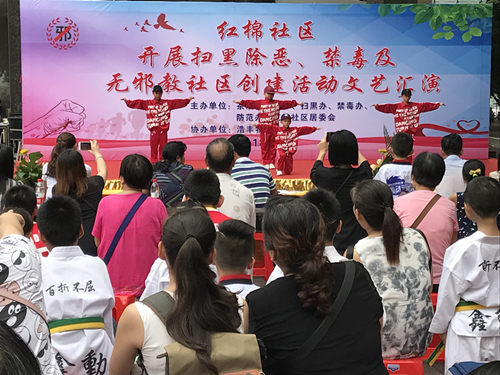 8月23日,茶滘街红棉社区在红棉大厦前举办了以扫黑除恶、禁毒及无邪教社区创建为鲜明主题的文艺汇演,吸引了社区300余名群众热情参与。