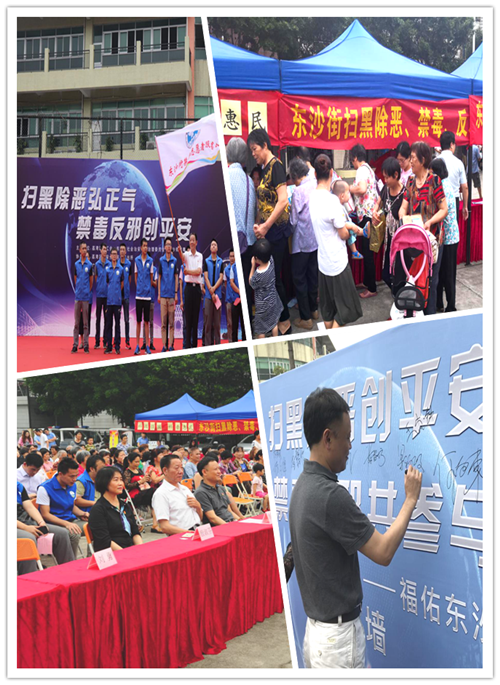 5月24日,东沙街在南漖社区文体广场举办以“扫黑除恶弘正气 禁毒反邪创平安”为主题的大型综合宣传活动,涵括扫黑除恶、禁毒、反邪教宣传、扫黄打非等内容。现场设立主舞台表演区、政策咨询区,图片展示区,共有500多名社区群众参与了活动。