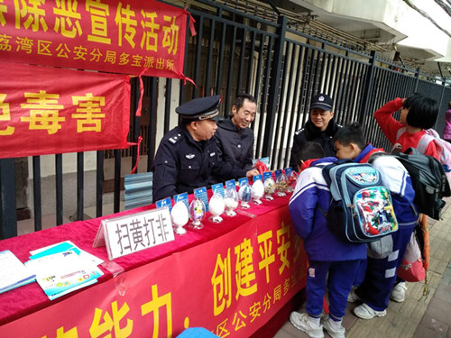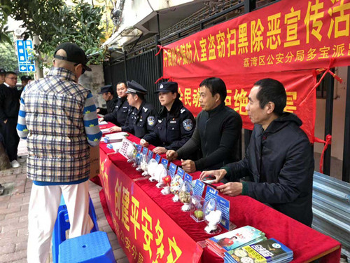 12月18日下午,多宝街综治办和多宝派出所在恩宁社区组织开展扫黑除恶专项斗争集中宣传活动。宣传中,工作人员紧紧围绕扫黑除恶专项斗争活动主题,结合实际,向居民广泛宣传扫黑除恶的有关法律常识,鼓励引导居民群众遵守法律法规,积极踊跃揭发检举黑恶势力违法犯罪线索。共有200余人参加了活动,有40余人进行了咨询,共发放宣传单张200份,纪念品100份。