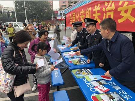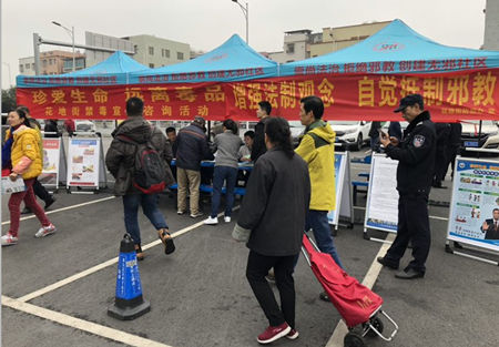 1月5日上午,花地街工作人员和花地派出所民警,在花地大道北沃尔玛广场开展禁赌、禁毒、反邪教、扫黑除恶宣传活动,向市民宣传关于“黄赌毒”、远离邪教、警惕诈骗等涉黑恶犯罪的防范知识,并派宣传单张。参与活动的市民约200多人。