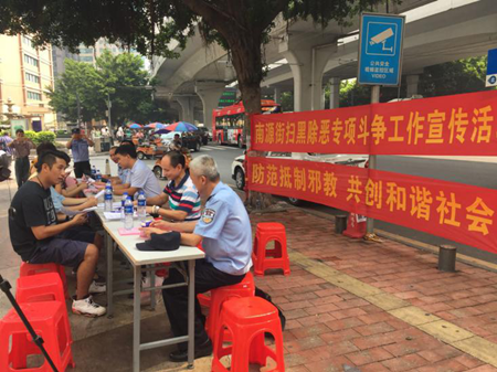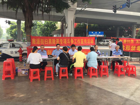 南源街2018年8月23日上午,威尼斯人app区南源街扫黑除恶办联合街派出所在南岸路圣地新天地广场举行“有黑扫黑,无黑除恶,无恶治乱”为主题的宣传系列活动。工作人员向居民派发了“致全区人民群众开展扫黑除恶专项斗争的公开信”、宣传小册子,讲解了扫黑除恶的重要性。
