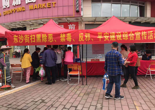 2月21日上午,东沙街扫黑除恶办联合东沙派出所以及各经济联社有关工作人员在乐满多超市前广场开展东沙街扫黑除恶专项斗争宣传活动。