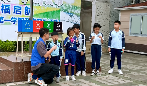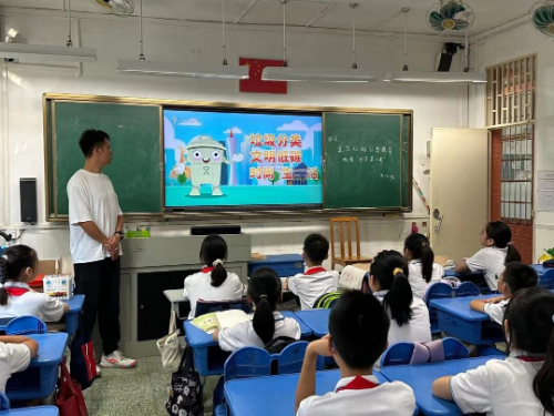 在东沙街东沙小学,工作人员给同学们上了一堂趣味生动的垃圾分类宣讲课,结合生活的具体实例让同学们了解生活中的垃圾种类和垃圾分类的意义作用。课堂上,志愿者们还通过有奖垃圾分类知识竞赛问答、投一投等多个趣味游戏,将垃圾分类与游戏互动结合。在场的学校老师也纷纷参与其中,与学生一起进行游戏互动。同学们纷纷踊跃参加,在愉快的玩游戏中学习并巩固垃圾分类知识,帮助他们从小树立垃圾分类和绿色环保意识,现场课堂气氛热烈。