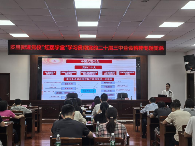 为深入学习贯彻党的二十届三中全会精神,深刻领会全面深化改革、推进中国式现代化的重大意义和总体要求,9月25日下午,多宝街道党校开展“红荔学堂”学习贯彻党的二十届三中全会精神专题党课,邀请区委党校蔡文芬老师以《认真学习贯彻党的二十届三中全会精神》为题到我街进行宣讲授课,机关党员干部、社区党组织党员、“三新”党组织党员共60余人参加。