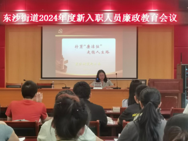 为加强干部职工纪法意识、底线意识和廉洁从政意识,8月5日下午,东沙街道党建办、纪检监察办在办事处一楼党校组织召开2024年新入职人员廉政教育会议。