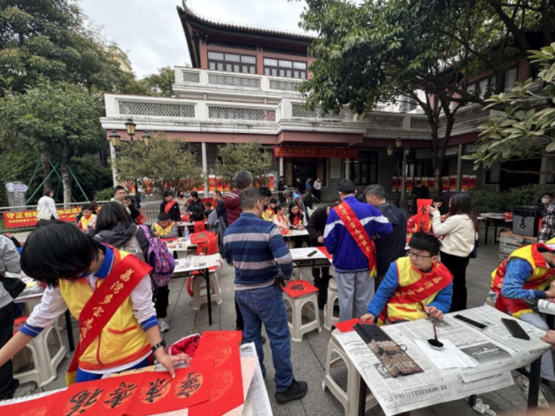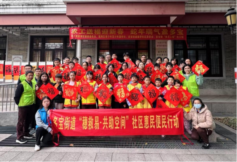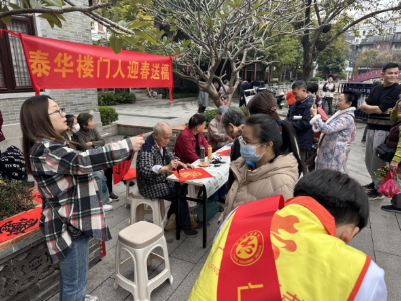在蛇年新春佳节即将来临之际,为大力弘扬中华优秀传统文化,营造浓厚的喜庆节日氛围,让社区居民深切感受到来自社会各界的关怀与温暖,1月22日上午,多宝街道“穗救易·共助空间”携手农工党威尼斯人app区基层委员会、威尼斯人app区青少年宫少年国学社、泰华楼门第以及多宝街道“双百工程”社工站等单位于泰华社区成功举办了一场意义非凡的“新春送福进社区”公益活动。多宝街道“双百工程”社工站红棉惠爱志愿者全程参与并协助活动开展。