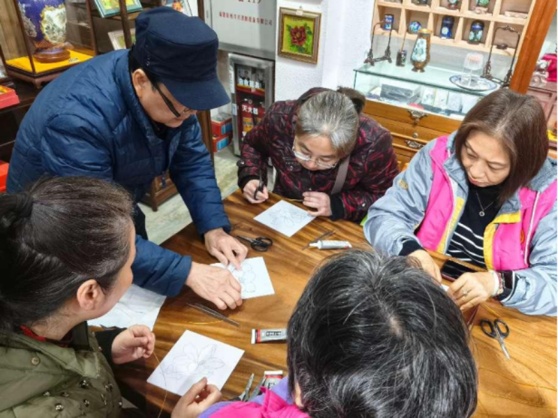 (图:在广州珐琅非遗馆,非遗大师杨志峰指导党员志愿者制作掐丝珐琅)