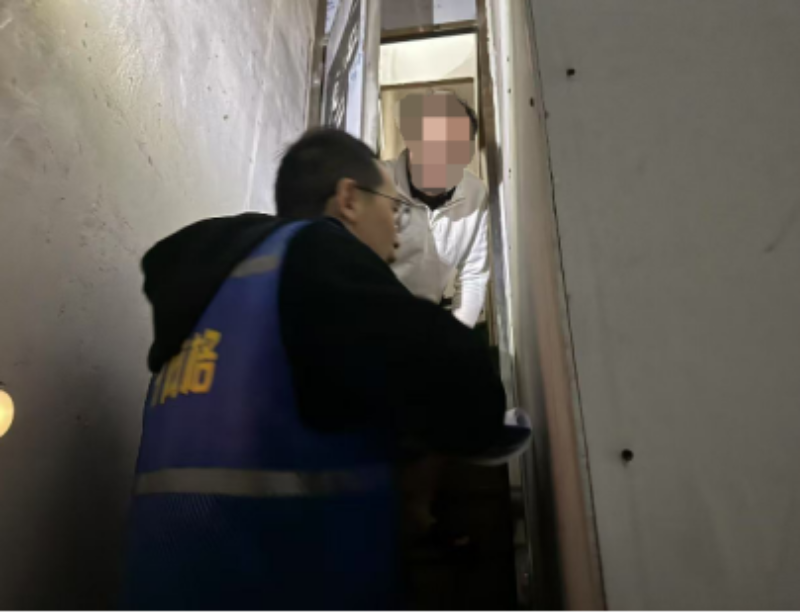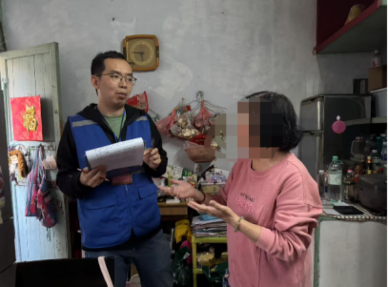 (图:网格员梁嘉俊到2楼了解情况)