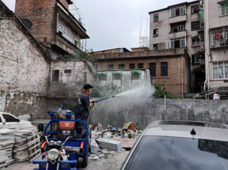 (图:消毒站对大地新街22-1屋后的无主空地进行消杀作业)