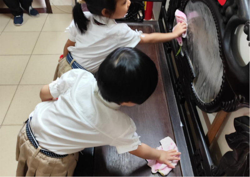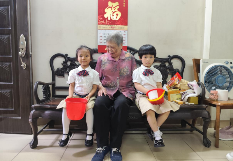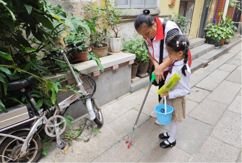 (图:小朋友走进辖区老人家中帮忙卫生清理)