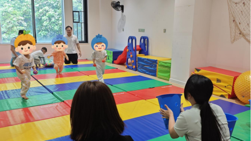 活动以"毛毛虫的成长之旅"为主线,通过绘本共读、互动游戏等环节,将早期教育融入趣味体验,孩子们化身可爱毛毛虫,在场地里蹦蹦跳跳,锻炼了四肢力量也提升了弹跳力。亲子指导员针对0-3岁婴幼儿发展特点,为家长讲解亲子共读技巧和家庭互动方法。