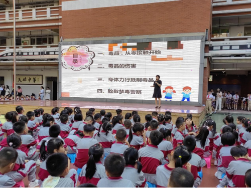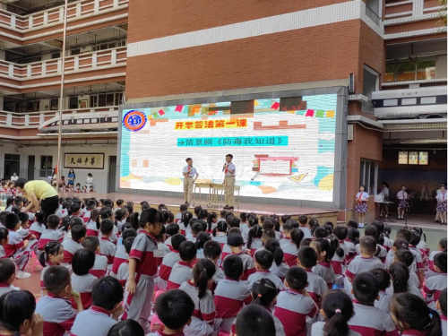在开学典礼上,由学生创作并演出的情景剧《防毒我知道》拉开了“开学普法第一课”帷幕,情景剧以学生喜闻乐见的形式,再现学生身边引诱他人吸毒的案例,让学生认识毒贩引诱吸毒的常用伎俩,进一步提升其防范毒品的技巧,加深学生对毒品的直观认识,有效地巩固了学生的辩毒能力。随后,法治宣讲副校长朱燕通过演示PPT的形式,针对学生好奇心强、辨别能力差、意志力薄弱、对毒品的危害认识不深等实际情况,用风趣幽默浅显易懂的语言开展安全普法教育,其中更深入介绍到被伪装成“奶茶”、“跳跳糖”、“邮票”等新型毒品,教育学生今后对毒品要练就一双“火眼金睛”。