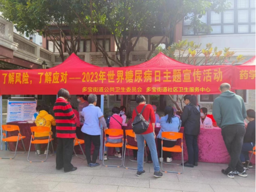 每年11月14日是世界糖尿病日,为普及宣传糖尿病防治的基本知识,唤起全社会对糖尿病的重视,倡导健康生活方式,2023年11月14日上午,多宝街道公共卫生委员会联合多宝街社区卫生服务中心在粤博北岸广场开展以“了解风险,了解应对”为主题宣传活动。