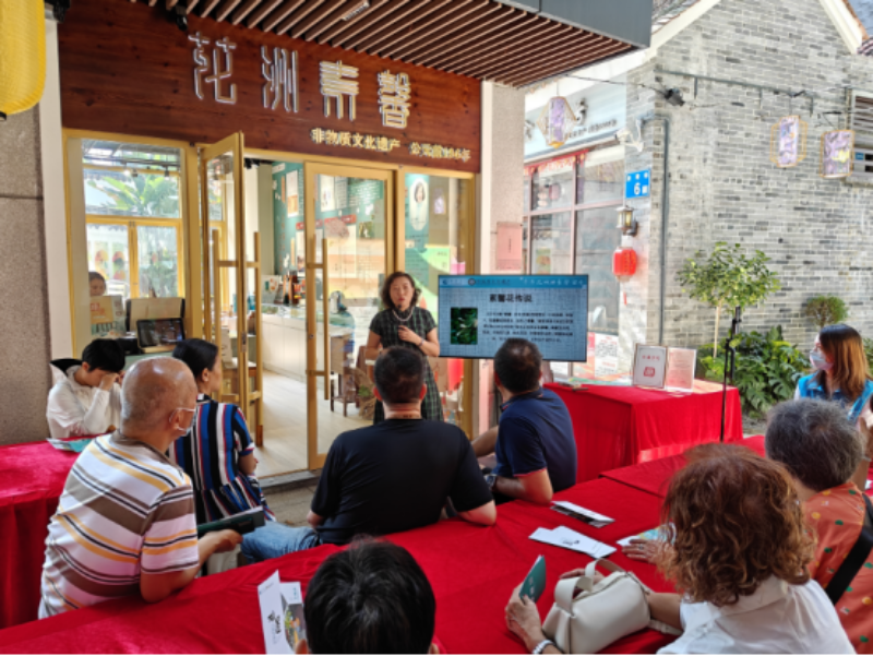 活动现场,素馨花非遗代表性传承人龙智敏老师首先为居民生动地讲述了“广州花事—素馨花传说”。她不仅追溯了素馨花的历史根源及其在广州的栽培与应用历史,还分享了素馨花在国际上的影响力。龙老师的精彩演讲仿佛将素馨花的故事带入了现实,使在场的每个人都仿佛置身于绚烂的花海之中,加深了对素馨花文化的认识和兴趣,并激发了他们对于这一传统文化遗产保护的热情。